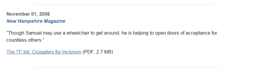 Additional Info: New Hampshire Public Television's "NH Outlook" received a documentary story merit award for "Including Samuel" at the New Hampshire Association of Broadcasters annual Golden Mike ceremony.